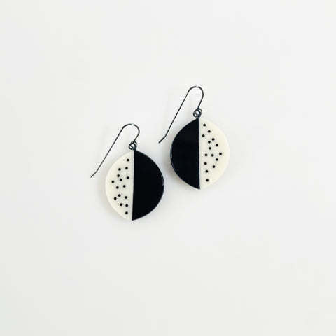 Leaf shaped drop earrings cast in the Tiki colour palette and white resin. Inlaid with scattered black polka dots.