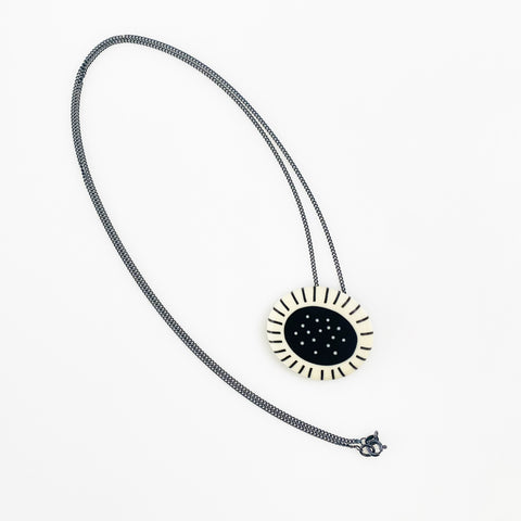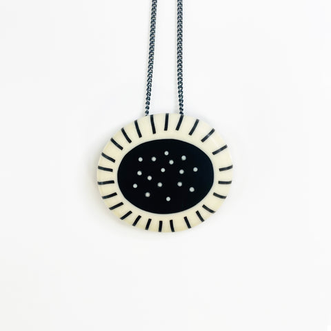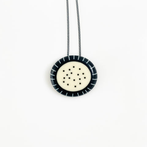 Oval shaped pendants cast in black and white resin and inlaid with scattered polka dots in the centre.